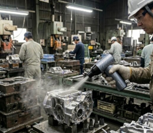 鋳造品の製造工程においては、洗浄後の部品を乾燥させる作業が発生します。洗浄液を素早く除去するためにエアブローが必要なのですが、圧縮エアの供給口が工場内の特定箇所にしか設置されていないため、作業者が毎回重い鋳造品を抱えてエア供給口のある場所まで移動しなければなりませんでした。この移動に要する時間と労力が積み重なり、1日あたりの作業効率に大きな影響を与えていました。特に重量のある大型鋳造品を扱う工程では、移動だけで1回あたり数分を要することもあり、現場の作業者からも強く改善を求める声が上がっていました。