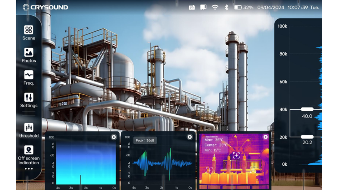 CRYSOUND CRY8120工業用音響イメージャは操作が簡単で、迅速に使用することができます。本装置はアルミ合金シェルを採用しており、頑丈で耐久性があり、複雑で変化しやすい作業環境にも適応できます。リアルタイムの音像表示により、加圧漏れや真空漏れの検出が、他の従来の方法に比べて格段に速く行えます。