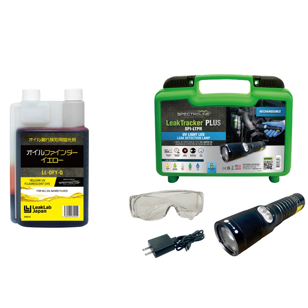 油漏れ・水漏れ用蛍光剤は、漏れ箇所を特定するために、油や水に微量に混入させて使用する特殊な染料です。紫外線ライトを照射すると蛍光を発光するため、漏れ箇所を容易に発見できます。設備保全や製品検査など、様々な分野で活用されています。
